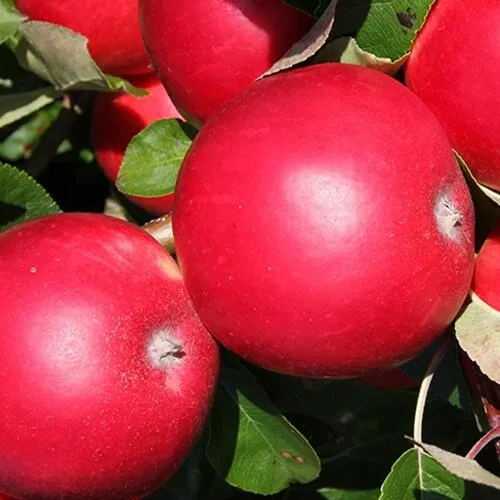 - Тринити. Дерево средних габаритов с фиолетовыми побегами. Высокоурожайный и скороплодный сорт. Зреют яблоки с конца августа по сентябрь. Плод тёмно-бордовый окраски, имеет коническую форму и вес в 180 грамм. Вкус приятный, десертный, кисло-сладкий. Хранятся до 4 недель. Дерево высокозимостойкое.
